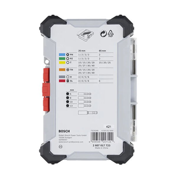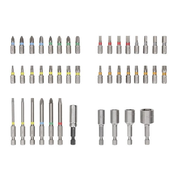 - PH1, PH2 (2x), PH3 / PZ1, PZ2 (2x), PZ3 / SL3, SL4, SL5, SL6 / H3, H4, H5, H6 / T10, T15, T20 (2x), T25, T27, T30, T40 / TH10, TH15, TH20 (2x), TH25, TH27, TH30, TH40 / PH2 / PZ2 / SL6 / T15, T20, T25 / 6, 8 ve 10 mm lokma anahtarı